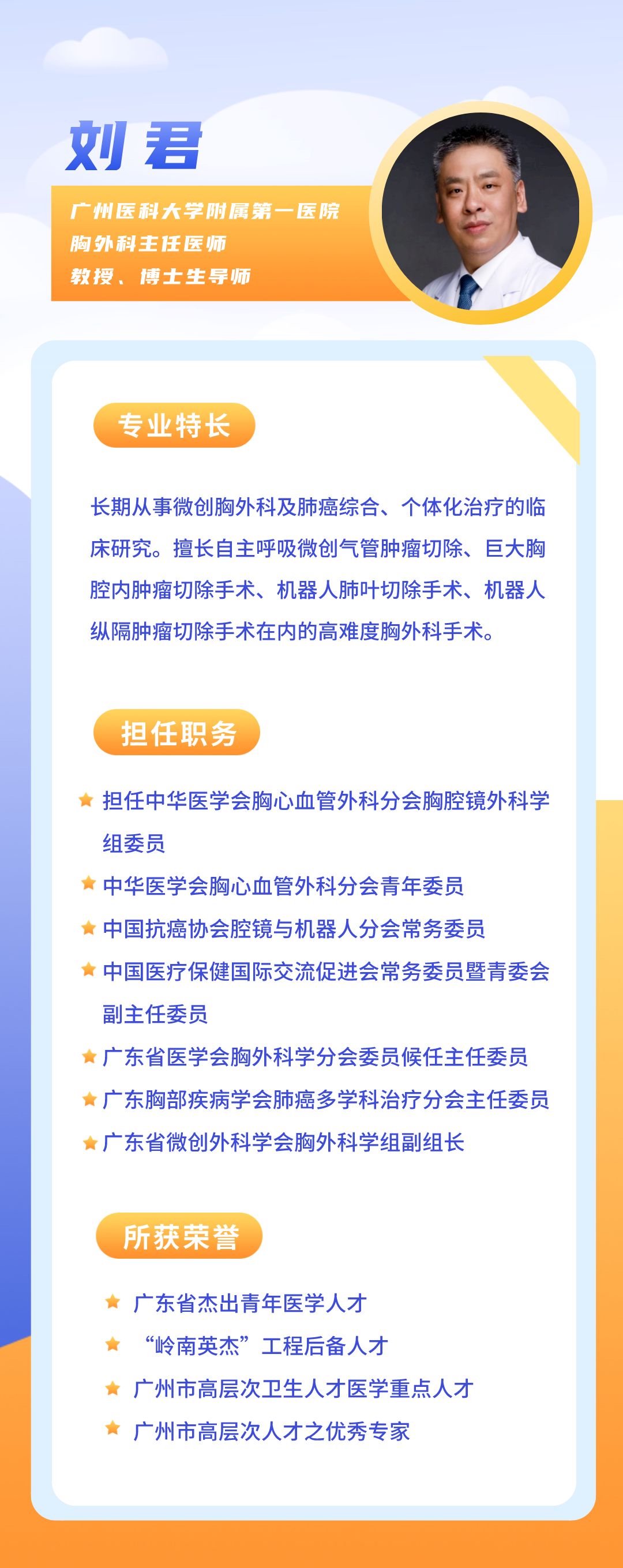 刘君教授是广州医科大学附属第一医院胸外科教授,国内著名的胸外科专家。刘君教授团队的引进,以及胸外科专科联盟的建立,将为该院带来更先进、更精准、更微创的胸腔镜微创手术理念,特别是他们原创的Tubeless微创技术、裸眼3D胸腔镜技术、荧光显影肺结节定位等,必将带来更先进的肺结节、肺癌诊治理念,为广大患者提供更前沿的诊疗服务。