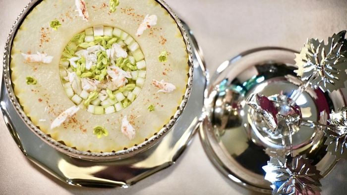 大暑时节,景煊精选时令食材,呈现仲夏美味。【鲜莲子八宝冬瓜盅】以鲜莲子、红花蟹肉、海螺肉、中谷瑶柱、烧鹅粒、金华火腿、苹果丝瓜、鲜草菇一同熬煮,每日现熬的鸡高汤为底,味道清而不淡、鲜而不俗,鲜莲子增加了一丝隐隐甘甜,使得味道更加清爽。