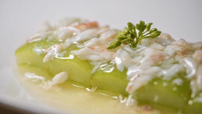 【生拆蟹肉扒黑毛节瓜】将黑毛节瓜去皮改刀,精准把控蒸制时间,保留其粉嫩口感和清甜原味。又以清鸡汤加入干贝、海米煨入鲜味,加入生拆的红花蟹肉与少许蛋白,制成芙蓉芡汁扣于黑毛节瓜上,嫩绿之上点缀红白两色,味道纯粹。