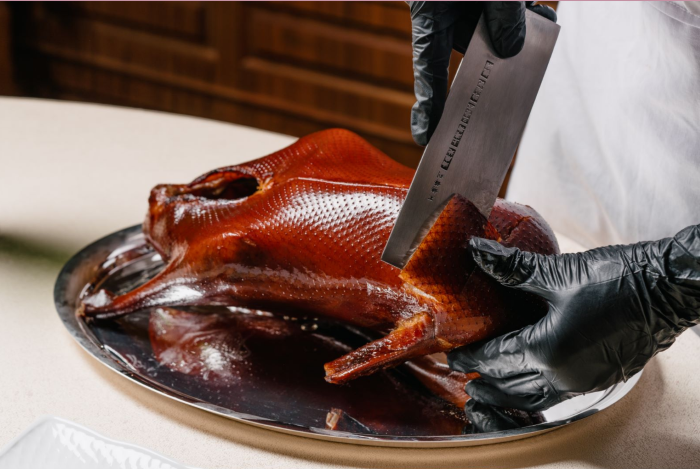 【挂炉脆皮烧鹅】选用生长期150天左右,重约6斤的乌鬃鹅,烤制前以特制的皮水涂抹于生鹅之上。烤制时火欠则生,火过则黑。完美的片皮鹅会呈现枣红色,鲜艳油亮,皮脆肉嫩。取一勺阿穆尔鱼子酱置于鹅皮上,鱼子酱的奶香与烤鹅的油润融合,柔软和清脆碰撞,微微的一丝咸味恰到好处,也让鹅肉的回甘更为鲜明。