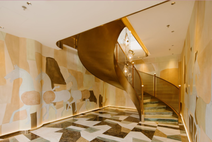 在意大利语中,SOLE代表太阳,景煊SOLE的门头正如其名,如太阳般绚烂夺目。推开玻璃的窄门,首先映入眼帘的便是满墙装点的汉代马匹设计以及几乎占据整个空间的旋转楼梯。柔和的米黄色、端庄的墨绿色与优雅的暗金色相互辉映,错落低垂的水晶吊灯悬挂而下。