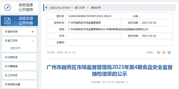 广州市越秀区市场监管局公示2023年第4期食品安全监督抽检信息