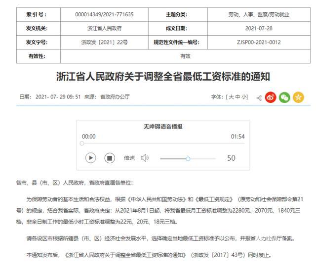 浙江省最低工资在2021年进行过调整