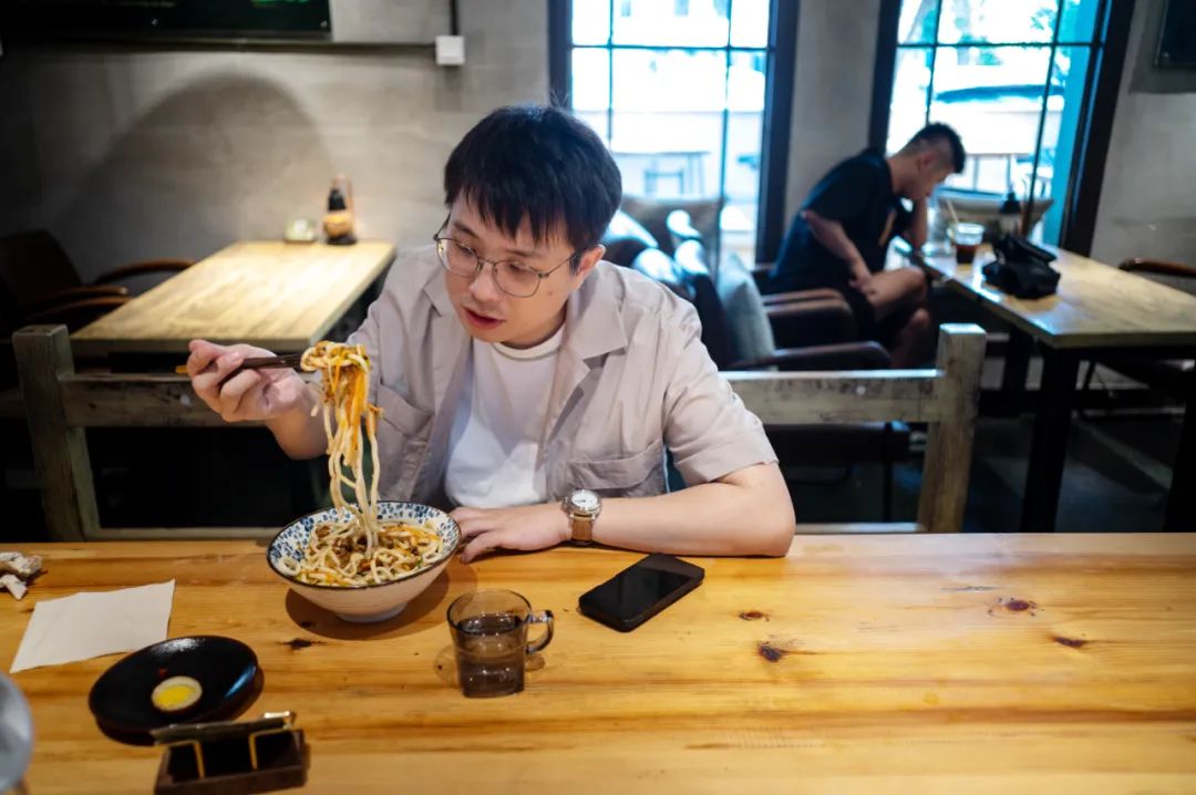 拍摄场地的楼下就是半度雨棚,多年以来,这里是M50文青聚会的胜地。不过这里白天人少,他兀自坐在过了饭点的安静店堂里,点了碗炸酱面。