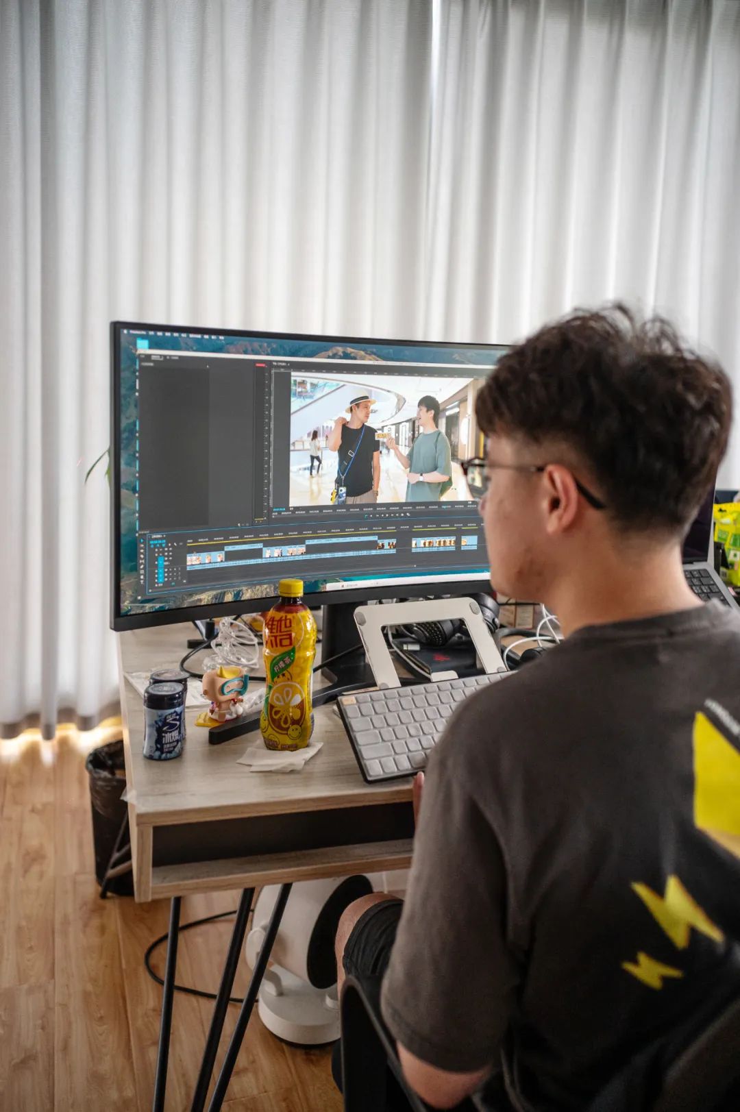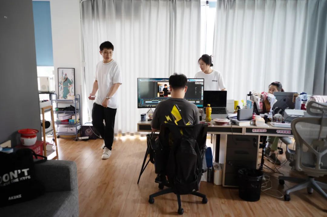 100多平方米的工作室没有隔断,开放式的影棚背后是排成一行的办公桌,所有人就聚在这里办公。剪辑师在电脑前忙碌地工作,项目很多,素材量大,现在在处理的内容是两周前录制的,编导小乔正在最后确认下午的拍摄文案。
