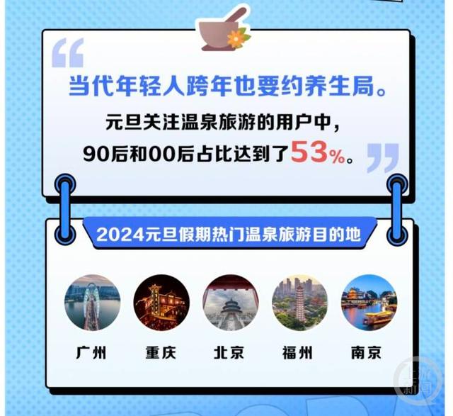 同时,有意思的是,兼具休闲和养生的温泉其实在年轻游客中人气一直不低。也正因如此,同程旅行的数据显示,广州、重庆、北京、福州、南京都是元旦假期最热门的温泉旅游目的地。