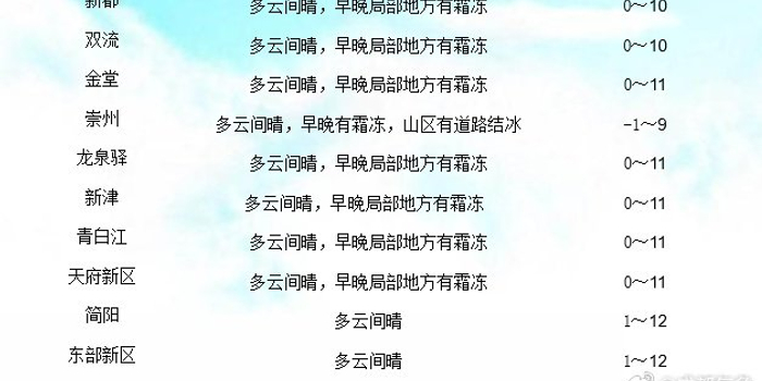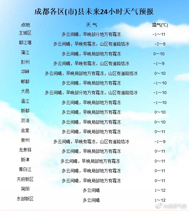 红星新闻网12月18日讯 据成都气象消息,今天阳光不错但总体体感还是冷,截至16时全市最高气温出现在东部新区11.2℃。预计今天夜间到明天白天多云间晴,早晚部分地方有霜冻,山区有道路结冰,气温-2~12℃;随后两天天空状况依旧不错,仍旧保持着晴间多云,气温在-1~12℃之间波动。市民朋友们一定要注意保暖哦!