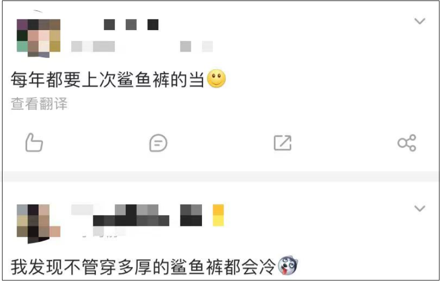 在成都大街上,也经常能看到鲨鱼裤+袜套+雪地靴此类的穿搭,商妹儿的好几个同事,也纷纷表示已购入了鲨鱼裤。