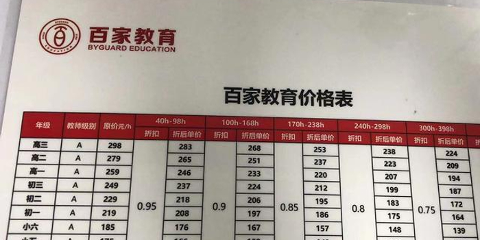 百家教育的课程价格表,买的课时越多折扣越多。 受访者供图