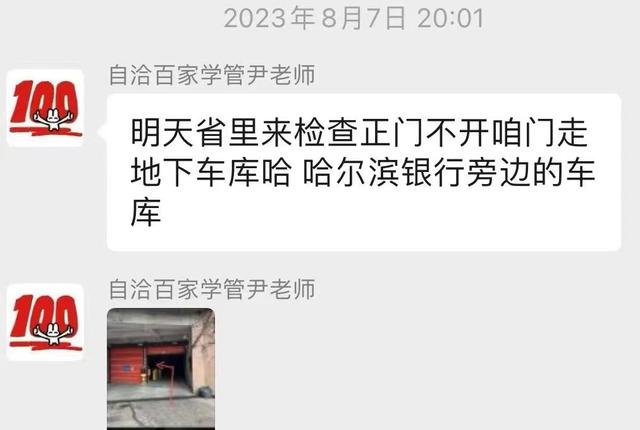 一名家长出示的与达慧学校老师的聊天记录显示,2023年4月和8月,老师分别有如下通知:“国家教育督查组下来检查双减暂停一天课”“省里来检查学校正门不开咱们走地下车库”。