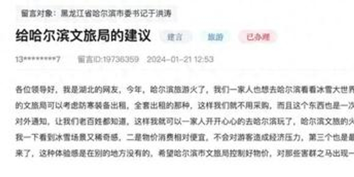 网民在留言中表示,自己是湖北人,想和家人到哈尔滨旅游,但网上说防寒装备价格较高,有点望而却步,而且在哈尔滨所需的冬季个人防寒装备在湖北用不上。该网民建议,希望哈尔滨文旅可以考虑防寒装备出租,游客就不用采购可能是一次性使用的东西了。