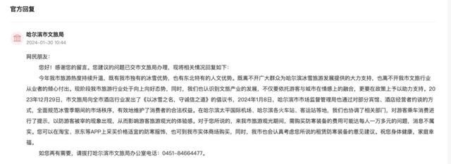 哈尔滨市文旅局表示,现阶段哈尔滨市旅游行业处于向上向好态势,也认识到文旅产业的发展,不仅要依托游客与城市在情感上的融合,更要在政策上予以助力支持。哈尔滨市会认真考虑该网民所说的租赁防寒装备的意见建议。