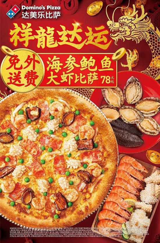 全球人气比萨品牌达美乐比萨为迎龙年新禧,重磅推出尊享系列新品:海参鲍鱼大虾比萨,招财进“鲍”;大吉大“栗”龙禧千层蛋糕登场;限定小食鸿运金元宝虾饼、年年有“鱼”鱿鱼饼惊喜回归,一家老小聚餐就选达美乐!