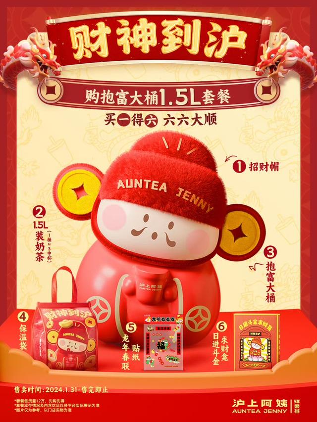新春之际,“财神到沪”啦!在沪上阿姨买抱富大桶1.5L套餐,可享买1得6——招财帽、1.5L装奶茶(=3中杯)、抱富大桶、保温袋、龙年春联贴纸、日进斗金求财龛,寓意六六大顺!该套餐1月31日开售,年味足、春意浓浓,售完即止。