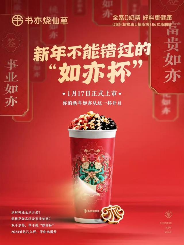 “如亦如亦随我心意”,书亦烧仙草提取中国传统祥瑞之物“如意”之灵感,全新上线新春不错过的“如亦”杯!将有关新年的祝愿,化作4张“如亦符”:富贵如亦、健康如亦、视野如亦、桃花如亦,祝你阔步走向更好的2024年!
