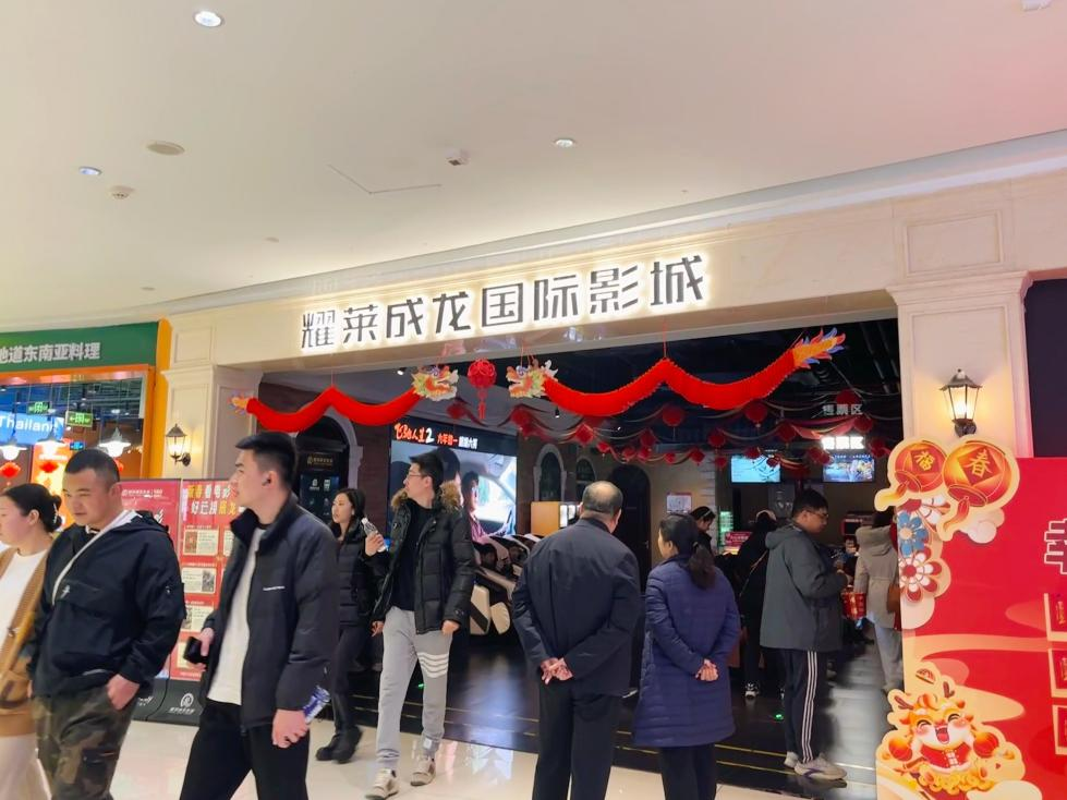 耀莱成龙国际影城人来人往,大厅内张贴着多张春节档影片海报,或是放置着宣传易拉宝。一眼望去,不少市民携着老人、孩子一同前来观影,真是喜气洋洋、阖家欢乐。在购票处附近,摆放着各色零食与饮料供消费者选购,一桶桶爆米花热气腾腾,气息香甜。