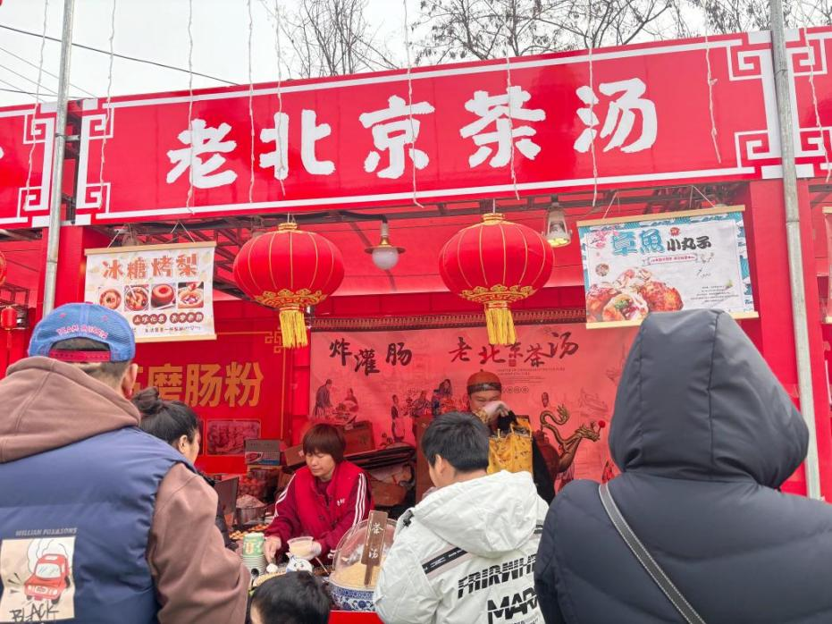 顺着人潮向前走去,一连串摊位招牌映入眼帘。老北京糖葫芦、旋风薯塔、烤肉串、牛杂汤……远远就能闻到香味,令人食指大动。