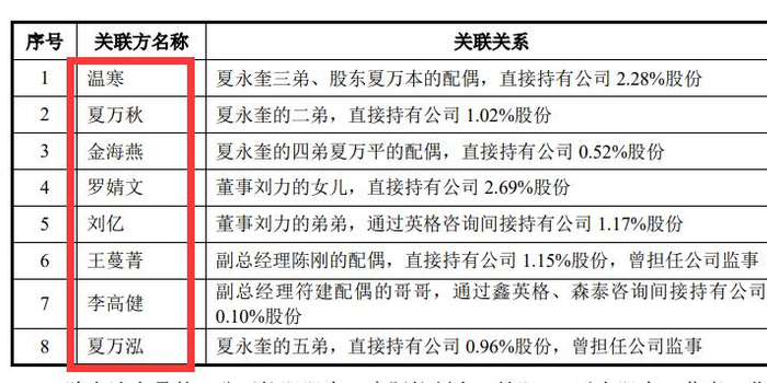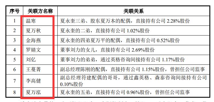 披露显示,刘敏与夏万秋、夏万泓、金海燕等皆是亲属关系,而另一实控人之一的夏永奎,则与刘敏是夫妻关系。
