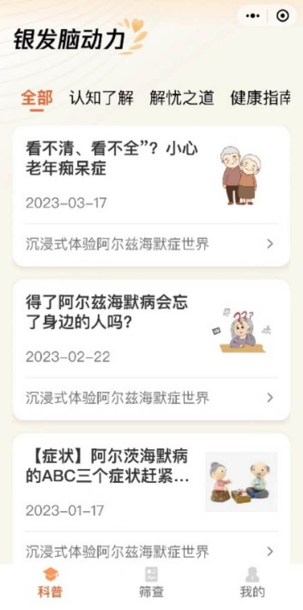 除了通过科普游戏提升大众对阿尔茨海默病的认知外,腾讯SSV银发科技实验室上线的《银发脑动力》小程序中,也提供了丰富的认知障碍科普音视频及文章,一方面可以帮助社区组织相关科普活动,另一方面也能帮助老人和家属了解相关知识和疾病管理方法。