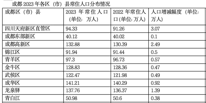 在成都市统计局3月19日公布的2023年成都市常住人口中,只有20个行政区(市)县的数据,四川天府新区直管区、成都高新区和成都东部新区三个城市新区并未单独列出。记者通过查阅成都市统计局官方微信公众号公布的相关数据,梳理出成都23个区(市)县中,常住人口增长情况(详见附表),最多的分别是四川天府新区直管区、成都高新区和新都区,分别为3.07万人、2.49万人和1.56万人。