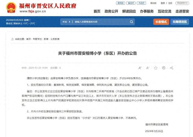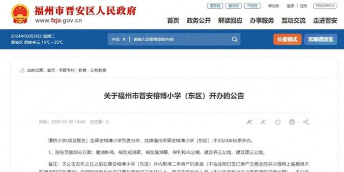 关注3月26日,福州市晋安区人民政府发布公告,潭桥小学将由晋安榕博小学负责办学挂牌福州市晋安榕博小学(东区),于2024年秋季开办。