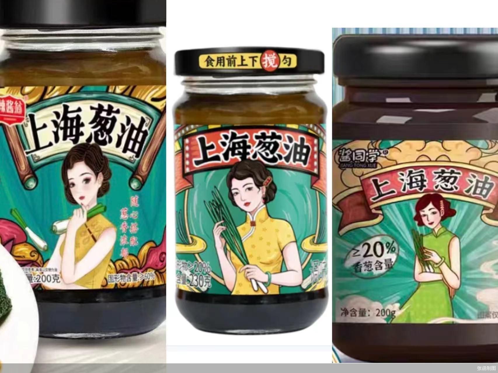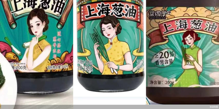 北京商报记者注意到,目前在电商平台上有不少包装、设计与仲景相似的上海葱油产品在售。例如在天猫、抖音等平台直播间,有不少产品用身穿旗袍、手持大葱的女性画像作为包装,画面上方也同样以横幅标出了“上海葱油”的字样,这与仲景上海葱油的包装设计极为相似。