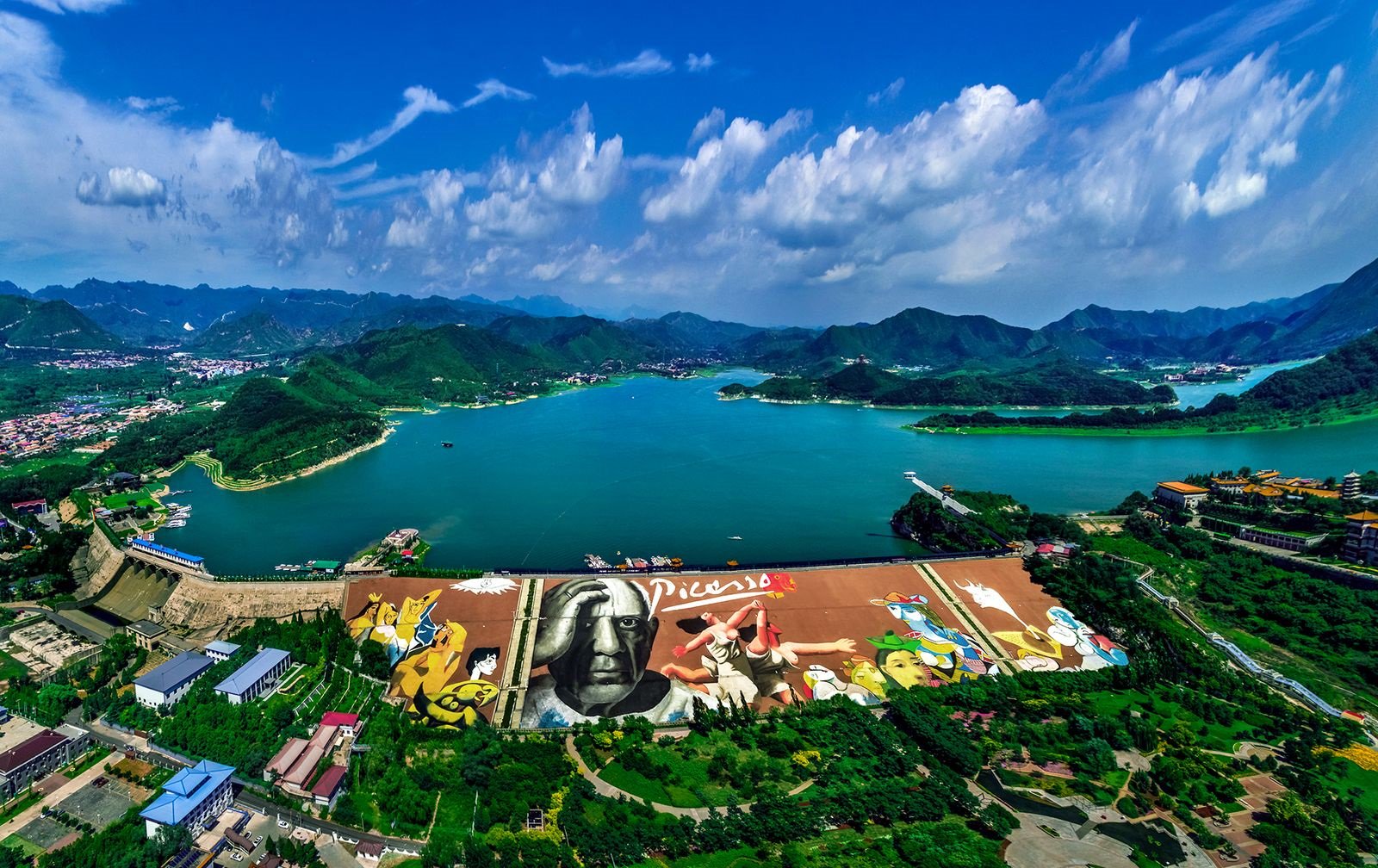 站在金海湖大坝上,放眼望去,一湖碧水映入眼帘,与由艺术巨匠毕加索创作的巨幅彩绘相映成趣,构成了一幅美丽的画卷。位于金海湖中心的碧波岛,拥有6.5平方公里的广阔水域,被誉为京津冀地区的天然氧吧。金海湖是北京市第三大水库,三面环山,峰峦叠翠,湖光山色美不胜收,让游客流连忘返。