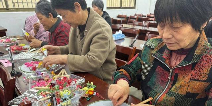 活动现场,志愿者提前准备了丰富多样的干花材料和空白的团扇。在所有参与人员就座后,志愿者耐心地向她们介绍干花团扇的制作方法和技巧,确保每一位女同胞都能充分理解并顺利制作。大家一边认真听讲制作方法和步骤,一边动手制作,根据自己的喜好挑选干花材料,巧妙搭配,用胶水将干花粘贴在团扇上。不一会儿,一朵朵栩栩如生的花朵便在团扇上绽放。在制作过程中,大家互相交流心得,分享彼此的创作灵感,现场氛围温馨而和谐。制作完成后,大家共同合影留念,相互展示自己的作品,共同庆祝这个充满欢乐和创意的春日时光。村民周阿姨说:“村里开展这种活动真的非常有意义,自从我参加活动后认识了不少朋友,也学会了不少手艺。”
