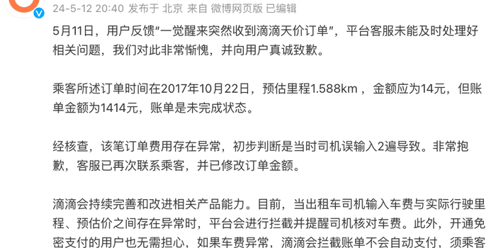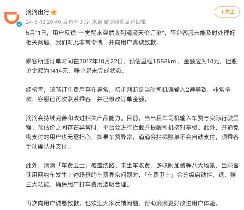 再次向用户诚恳致歉。也欢迎大家反馈问题,帮助滴滴更好改进用户体验。
