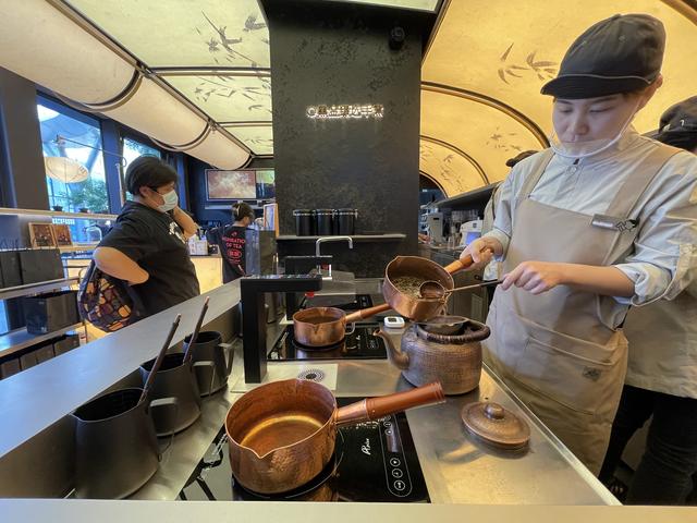 “竟然喝到手煮茶了!果然国风才是最高级的。”消费者小韩一直是奶茶爱好者,趁着午休时间兴冲冲前来排队“打卡”。操作台前,店员正对着三只紫铜茶锅,依次放入茶叶、倒水、开火、手工慢搅、滤出茶液,小韩拿手机录下现场煮茶过程,三款“手煮乳茶”也成为点单率最高的“爆款”。