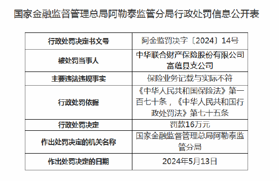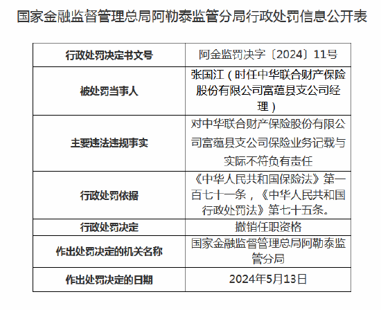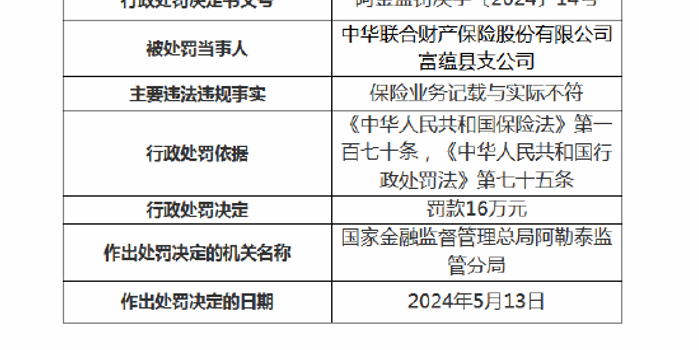 据罚单显示,中华联合财产保险股份有限公司富蕴县支公司因保险业务记载与实际不符,被阿勒泰监管分局罚款16万元;张某江(时任中华联合财产保险股份有限公司富蕴县支公司经理)被撤销任职资格。