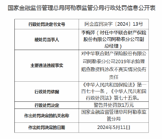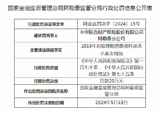 中华联合财产保险股份有限公司阿勒泰分公司因2019年农险理赔查勘资料涂改不真实情况,被阿勒泰监管分局罚款20万元;张某杰(时任中华联合财产保险股份有限公司阿勒泰分公司总经理)被警告并罚款1.5万元,李某萍(时任中华联合财产保险股份有限公司阿勒泰分公司副总经理)被警告并罚款1万元。
