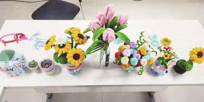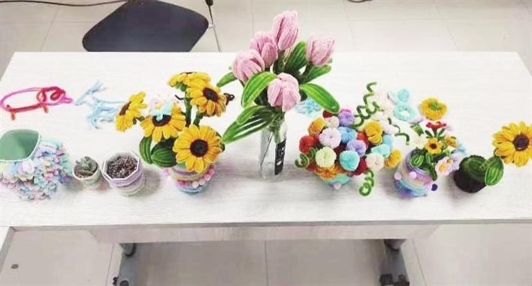 活动开始前,社区工作人员为大家准备了扭扭棒配套材料,还有热熔胶、酒精胶、空瓶、空纸盒等,同时向社区党员和居民群众介绍了扭扭棒DIY制作方法和本次活动意义。随后,大家一起研究分享扭扭棒“郁金香”、向日葵、笔筒、花瓶的制作方法,并且拿起手中的材料,通过自己的创意和想象力开始精心创作,扭一扭、弯一弯、拉直、铺平、交叉、打结……经过一个多小时的努力,大家都完成了美丽的“郁金香”“向日葵”成品,还有的居民制作了蝴蝶、桃心、笔筒、花瓶等,居民们互相欣赏交流并拍照留念。