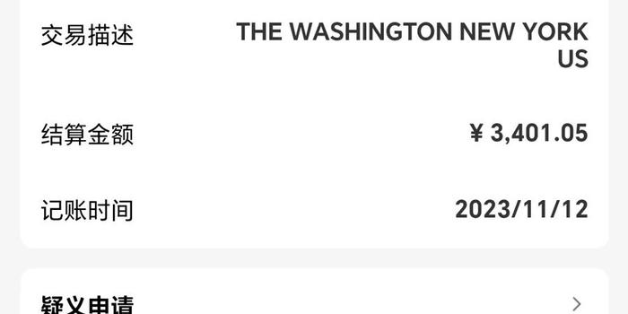 张女士向记者讲述了事情的来龙去脉:去年11月10日,她通过Agoda平台预订了纽约一家名为“The Washington by LuxUrban”酒店的房间,入住日期是今年的4月26日至28日的两个晚上。给平台提供了信用卡账号后,她很快收到465.54美元的扣款通知。银行账单显示是酒店方直接发起的扣款,银行于去年11月12日入账,折算下来为人民币3401元。
