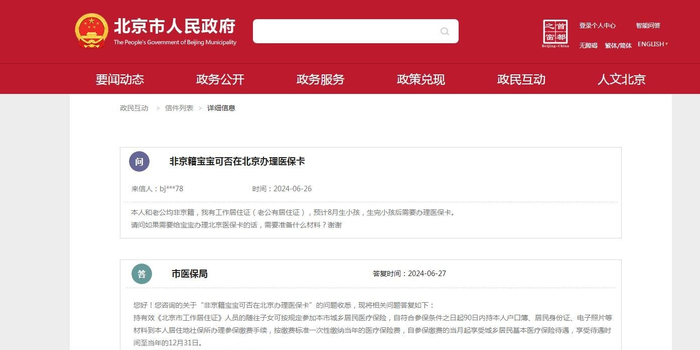 关注近日,有市民通过北京市政府官方网站提问;本人和老公均非京籍,我有工作居住证(老公有居住证),预计8月生小孩,生完小孩后需要办理医保卡。请问如果需要给宝宝办理北京医保卡的话,需要准备什么材料?