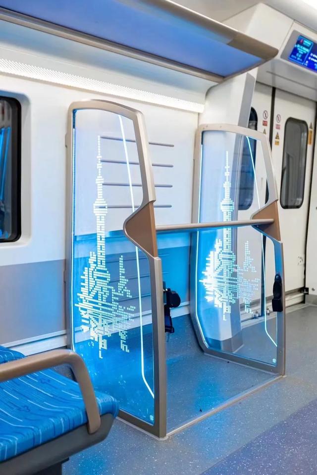 走上列车,就能看到一个两层的发着光的大件行李存放处。行李架两侧的玻璃上用了东方明珠点阵画装饰,下层还设置了一条“安全带”,放至行李箱滚动。另外,座位的上方也都设置了一层行李架。
