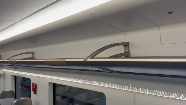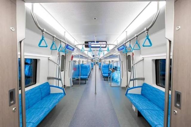 市域铁路列车的座位采用横纵结合的设计,每节列车大约有50多个座位。横排座位的底下设置了5眼的插座,纵排座位的附近则设置了USB接口和无线充电。参考地铁列车,市域铁路列车也设置了拉环扶手,供乘客站立时扶握,车厢内部还设置了专门停放轮椅的地方。