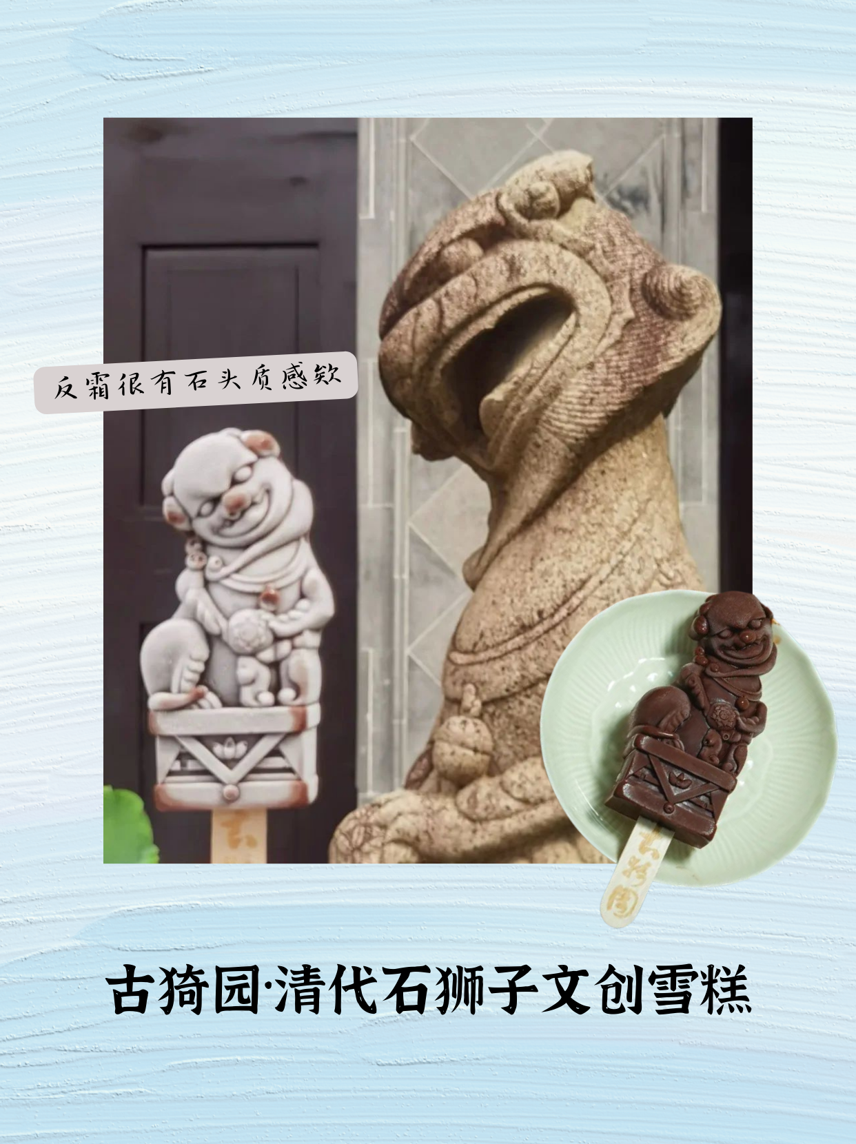 2024年今夏新品,设计灵感源于古猗园南门外的可爱石狮子,不同于脚踩绣球的石狮子形象,它把荷花绣球“捧在手心里”。巧克力口味的雪糕在常温中,水汽化为冰霜,温差反霜显出石头质感!
