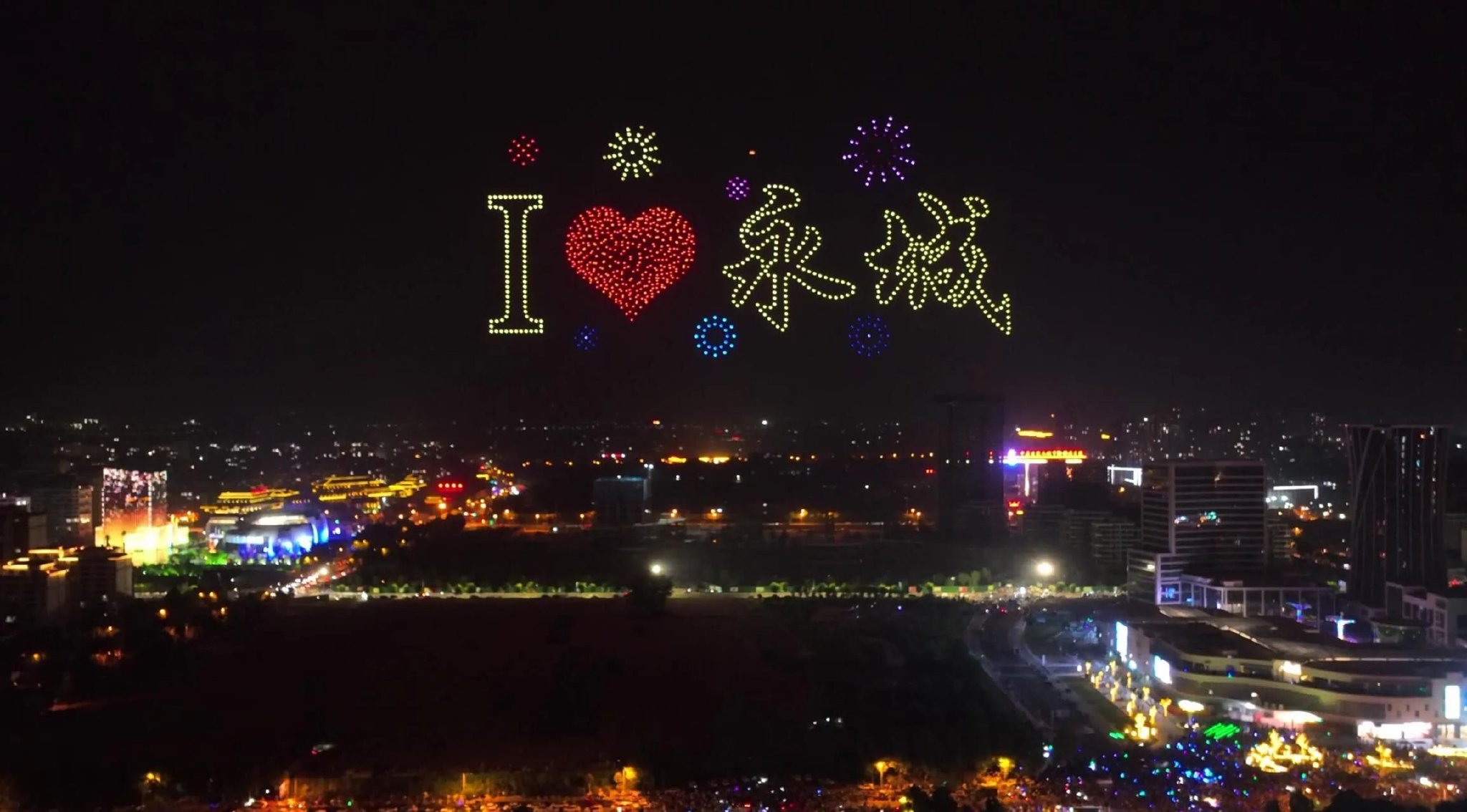 一千架无人机在专业的表演团队的操作下,展示着“永城的古城门”、“崇法寺佛塔”、“汉高祖斩蛇起义”、“鲸落万物生”、“大国航天梦”等动感画面,聚似精灵,散作满天星,绽放出最美的姿态,彰显永城的年轻与活力、开放与包容。