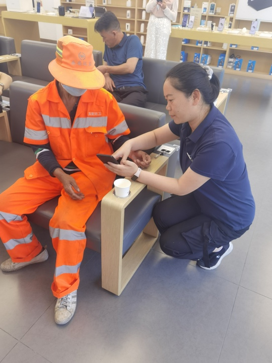 店长贴心地邀请爷爷坐下来休息,但他却担心身上的衣服弄脏店里,显得很不好意思。这时店长介绍道,我们服务店一直为环卫工人提供免费的休息区和饮水区,高温天气,随时可以来休息和接水。随后,店长主动递给爷爷一杯水,并安排工程师检测手机。