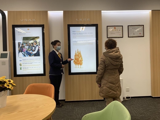 业务办理完后,服务人员引导李阿姨来到了客户经营区展示大屏前,对阳光品牌、“阳光暖阳日”特色助老服务以及臻橙服务做逐一讲解,帮助客户进一步了解阳光、信任阳光。