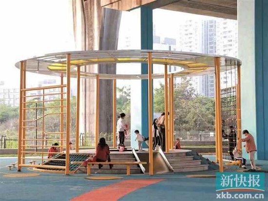 ■桥底变身色彩斑斓的游乐场,孩子们在家长陪伴下嬉戏。