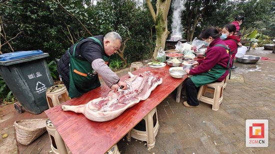 “来哟,烫毛刮猪咯!” 随着村民一声洪亮吆喝,三百余斤重的粮食猪被抬上案板,孩子们好奇地围拢过来观看;大人们则分工协作,挽起袖子揉面、擀皮、包馅,动作娴熟利落,欢声笑语间,一个个饱满的饺子很快摆满了案板。凉拌猪香嘴、红萝卜烧肥肠、蒜苗回锅肉…… 村民们系着围裙,陆续端出一道道热气腾腾的农家菜,浓郁的香味在院子里肆意弥漫,勾动着每个人的味蕾。