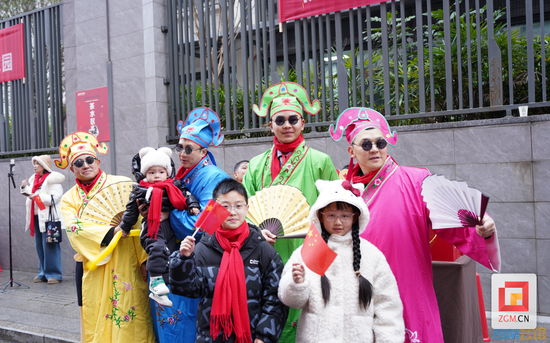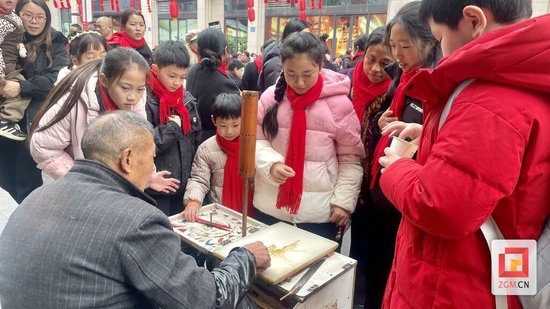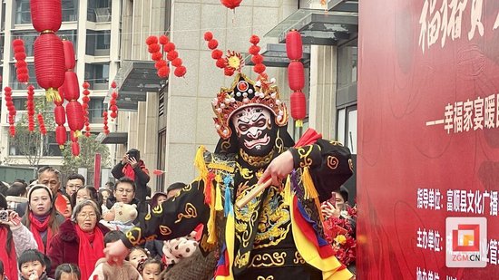 “财神驾到福气满,才子相伴文脉长。”伴随主持人一声吆喝,全场目光聚焦。团圆宴民俗展演率先拉开序幕,“四大才子”伴福巡游,庖丁师傅手起刀落间完成分肉仪式,“吉猪纳吉”仪式将原汁原味的川南年俗生动呈现。“五谷祈福”环节,富顺县总商会负责人将寓意吉祥的谷物撒向现场。五谷落地,掌声雷动。“这就是记忆里最地道的年味。”北湖一号小区的李大爷边录视频边感慨道。