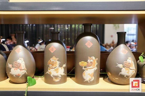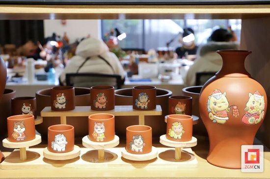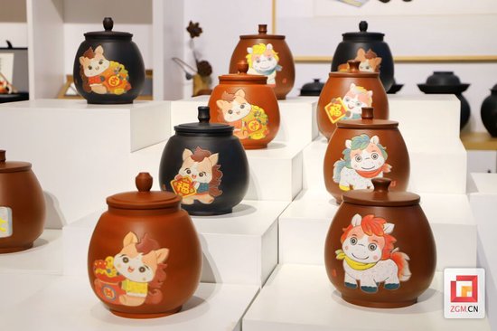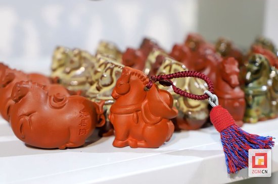 图为:2月1日,记者拍摄的各类卡通范、复古风马年元素文创陶。