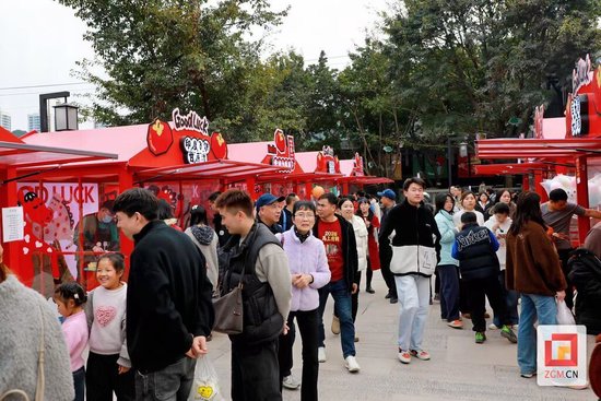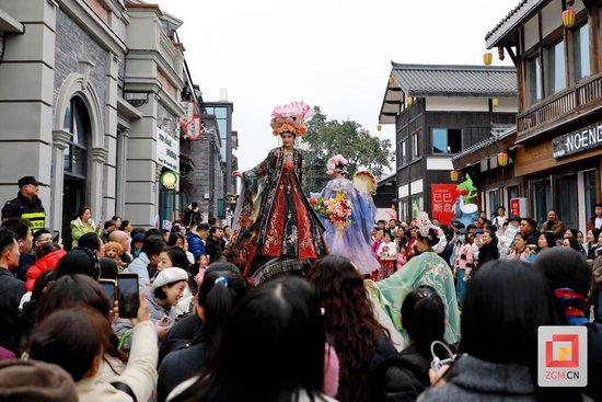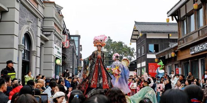 锣鼓声里,“山海奇遇”贺岁戏剧在街中广场开演,《东方山海焕新春》《吾凰之上》等国潮大秀赢得阵阵掌声。花神踩着高跷穿梭巡游,“盐值”财神不时向人群派发福袋,孩子们追逐嬉笑,将100余场互动的热闹推向高潮。一旁的“马上喜市”飘来冷吃兔的香气,文创摊前挑选伴手礼的游客络绎不绝,年味在烟火气中弥漫开来。