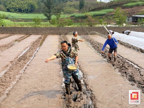 沿滩区联络镇江冲村村民正在撒种 记者 罗祥瑞 摄