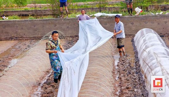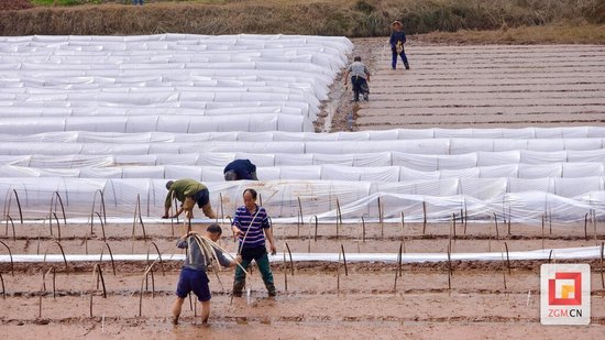 沿滩区联络镇江冲村村民正在覆膜 记者 罗祥瑞 摄