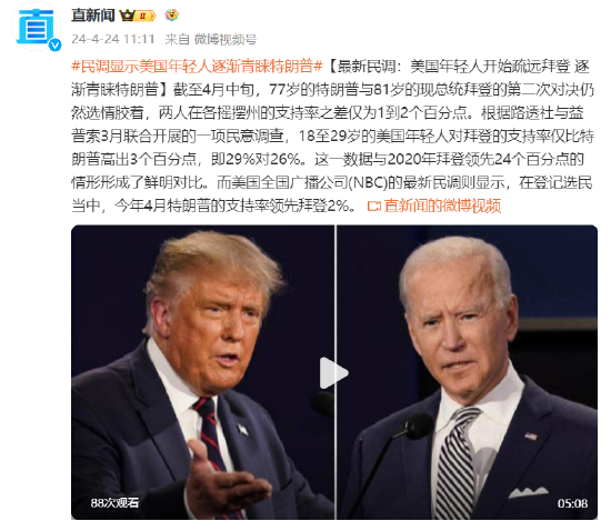 #民调显示美国年轻人逐渐青睐特朗普#[最新民调:美国年轻人开始疏远拜登 逐渐青睐特朗普]截至4月中旬,77岁的特朗普与81岁的现总统拜登的第二次对决仍然选情胶着,两人在各摇摆州的支持率之差仅为1到2个百分点。根据路透社与益普索3月联合开展的一项民意调查,18至29岁的美国年轻人对拜登的支持率仅比特朗普高出3个百分点,即29%对26%。这一数据与2020年拜登领先24个百分点的情形形成了鲜明对比。而美国全国广播公司(NBC)的最新民调则显示,在登记选民当中,今年4月特朗普的支持率领先拜登2%。