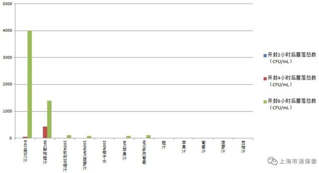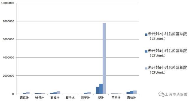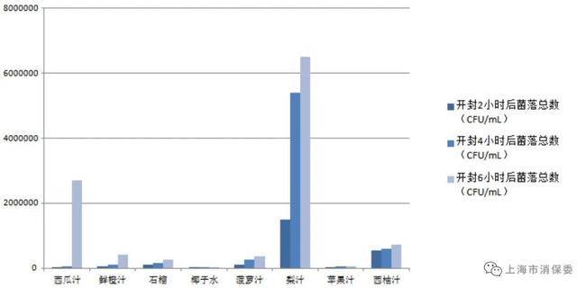 以鲜水果压榨工艺的果汁,即鲜榨果汁,在开封喝过2小时后,有的菌落总数就已经超过国家标准规定限量,最高的一款梨汁达到了1500000CFU/mL,那些没超过限量的鲜榨果汁,菌落总数也随着时间大量繁殖,开封喝过4小时、6小时后,大部分鲜榨果汁的菌落总数超过了国家标准规定限量的范围,增长速度最快的一款西瓜汁在开封6小时后菌落总数与开封2小时数据相比增长了近586倍。